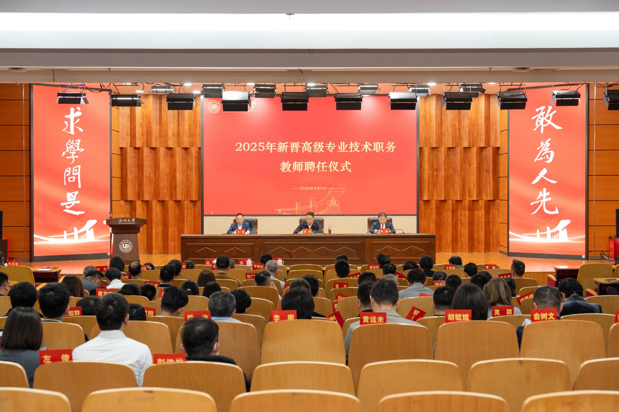 2026年4月9日,温州大学2025年新晋高级专业技术职务教师聘任仪式在南校区岩松堂雁山厅隆重举行。聘任仪式既是对新晋职称教师的使命光荣、责任在肩的强化,也是学校深化现代大学治理、推进人才强校战略的重要实践。校党委书记钱强、校长赵敏出席仪式,副校长王舜主持仪式,2025年新晋高级专业技术职务教师、二级学院院长和相关职能部门负责人参加活动。